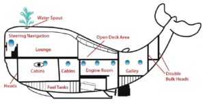 Viele technische Daten des Wal-Unikats konnte ich nicht in Erfahrung bringen aber der Querschnitt durch den Rumpf offenbart doch einiges. Die Platzverhältnisse sind alles andere als beengt und nicht zu vergleichen mit meiner Blue Whale. Auf der Homepage gibt Tom zu, etwas mehr Luxus in die Ausstattung investieren zu wollen.